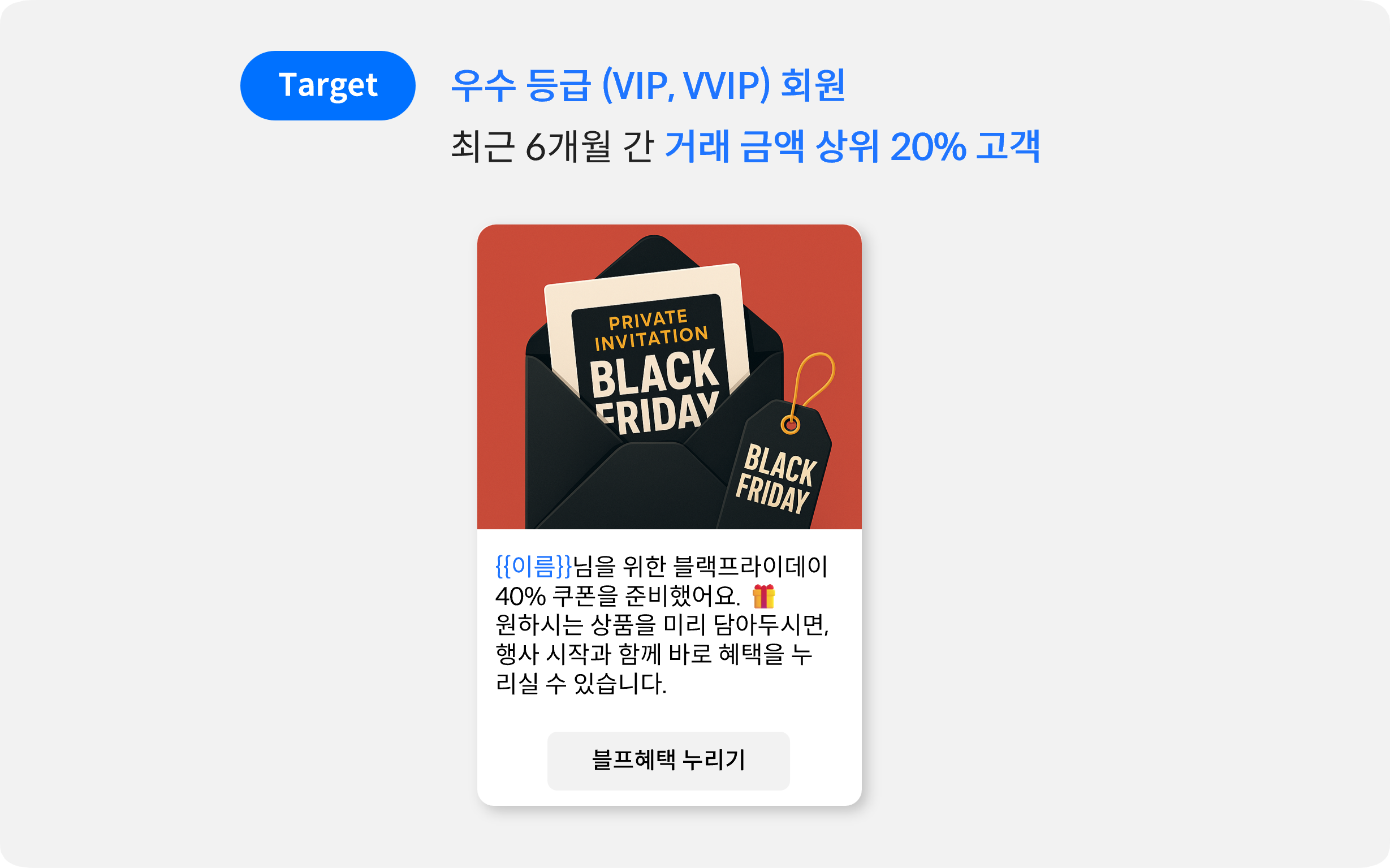 타겟 | 충성 고객(우수 등급 또는 최근 6개월 간 거래 금액 상위 20% 고객) 중 블프 기간에 구매하지 않은 고객