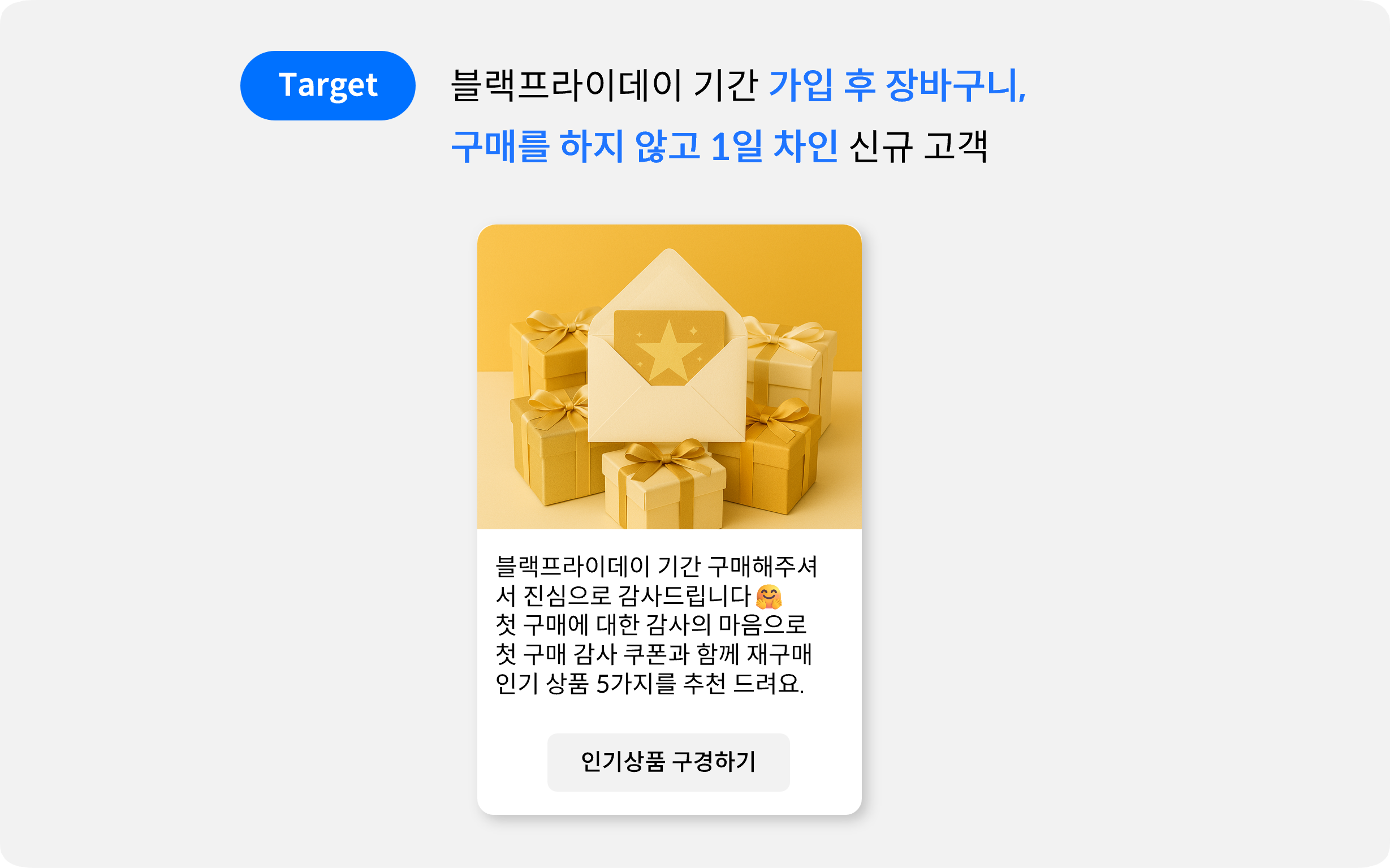 메시지 | 블랙프라이데이 기간 동안 00브랜드를 이용해 주셔서 진심으로 감사드립니다. 첫 구매에 대한 감사의 마음으로 첫구매 감사 쿠폰과 많은 고객님들이 사랑한 재구매 인기 상품 5가지를 추천드려요. 쿠폰은 발급 후 30일 이내 사용 가능하오니, 다음 쇼핑에서도 00브랜드와 함께하세요.