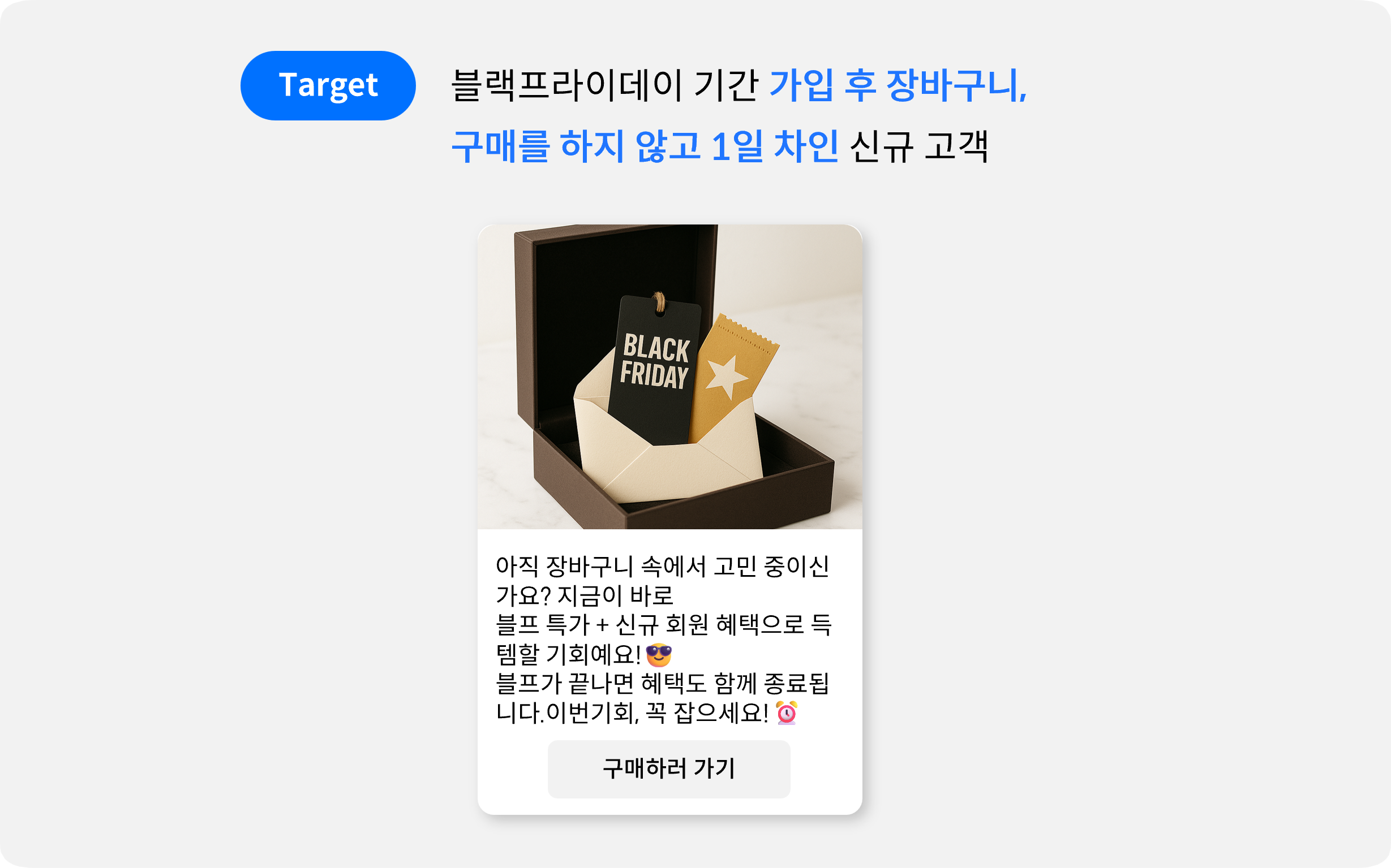 타겟 | 블프 기간 내 가입하지 않은 기존 고객 중 장바구니에 담은 후 구매하지 않고 1일 차 고객